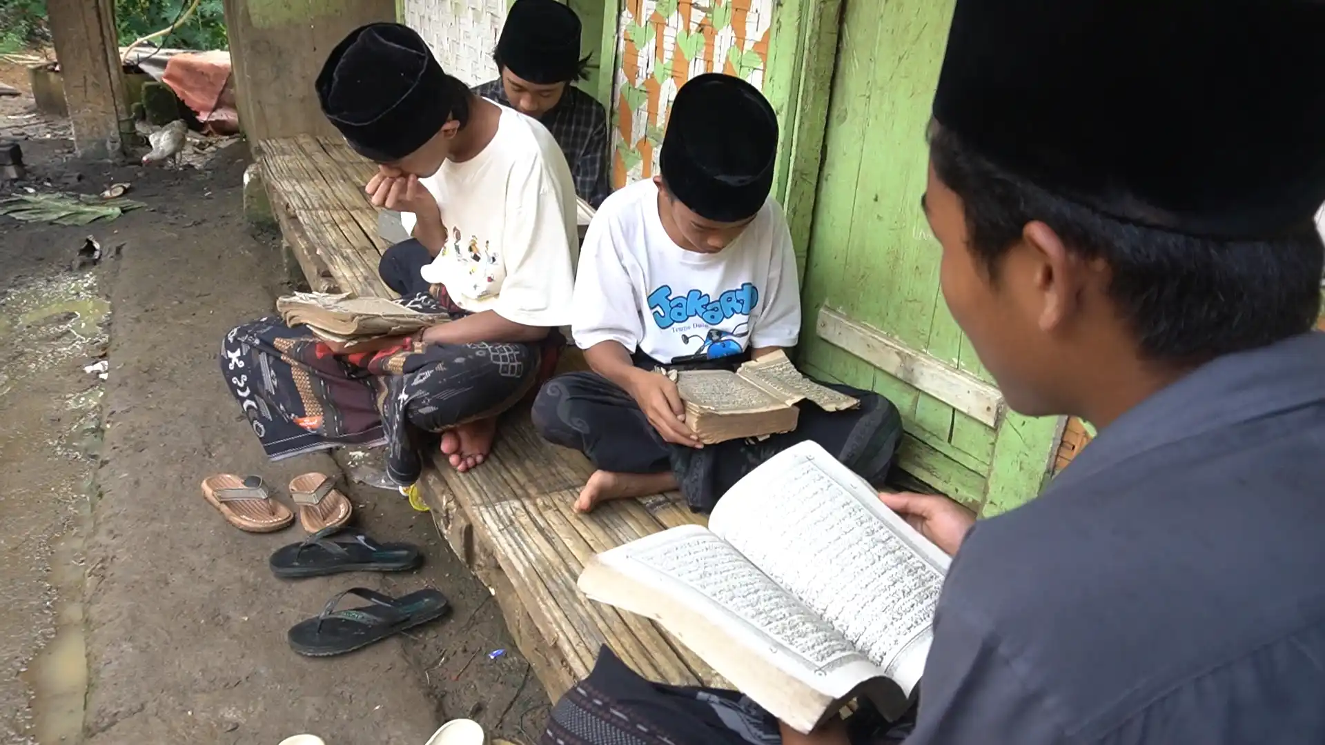 Anak-anak yang ingin belajar mengaji harus bergantian satu mushaf untuk banyak orang.